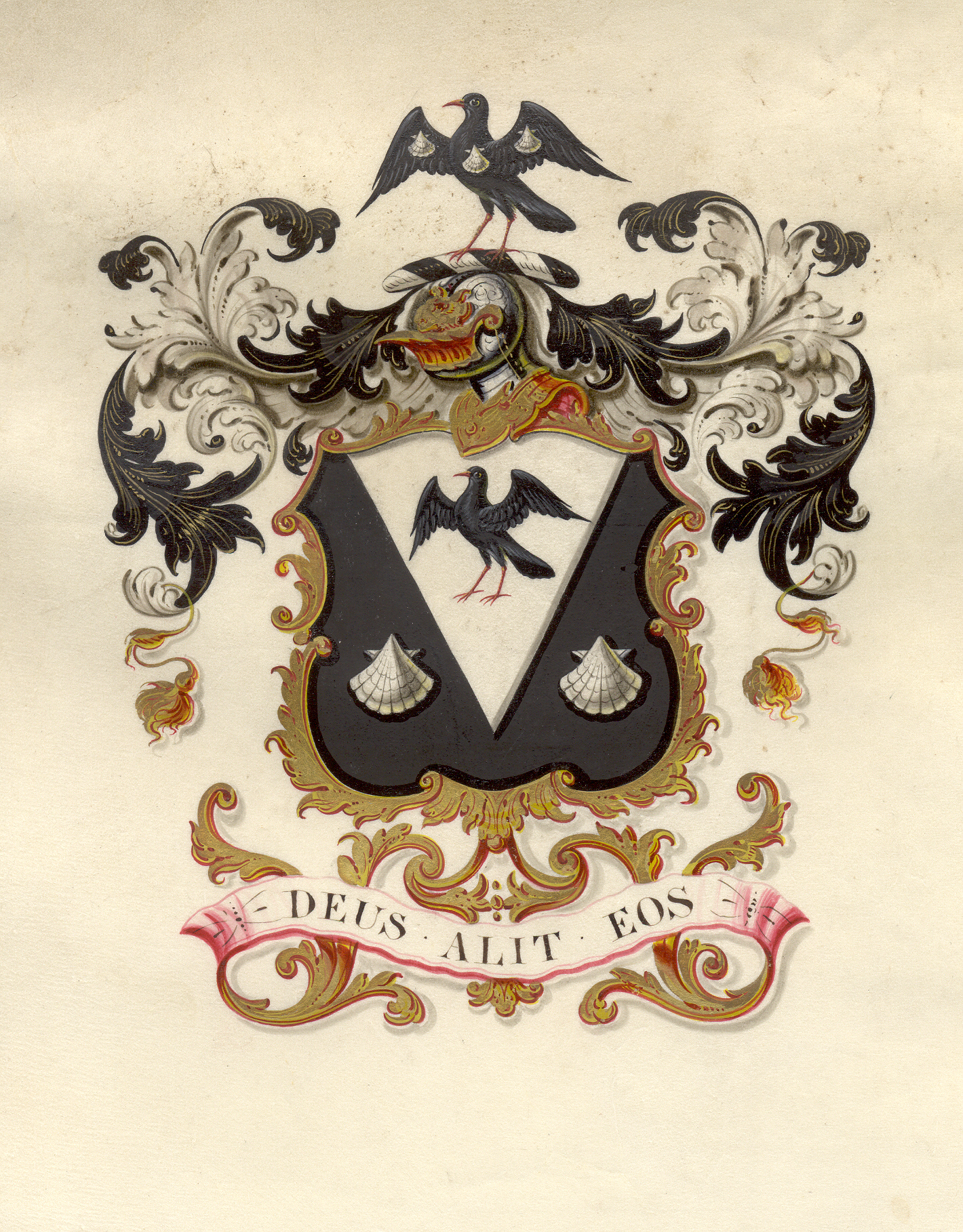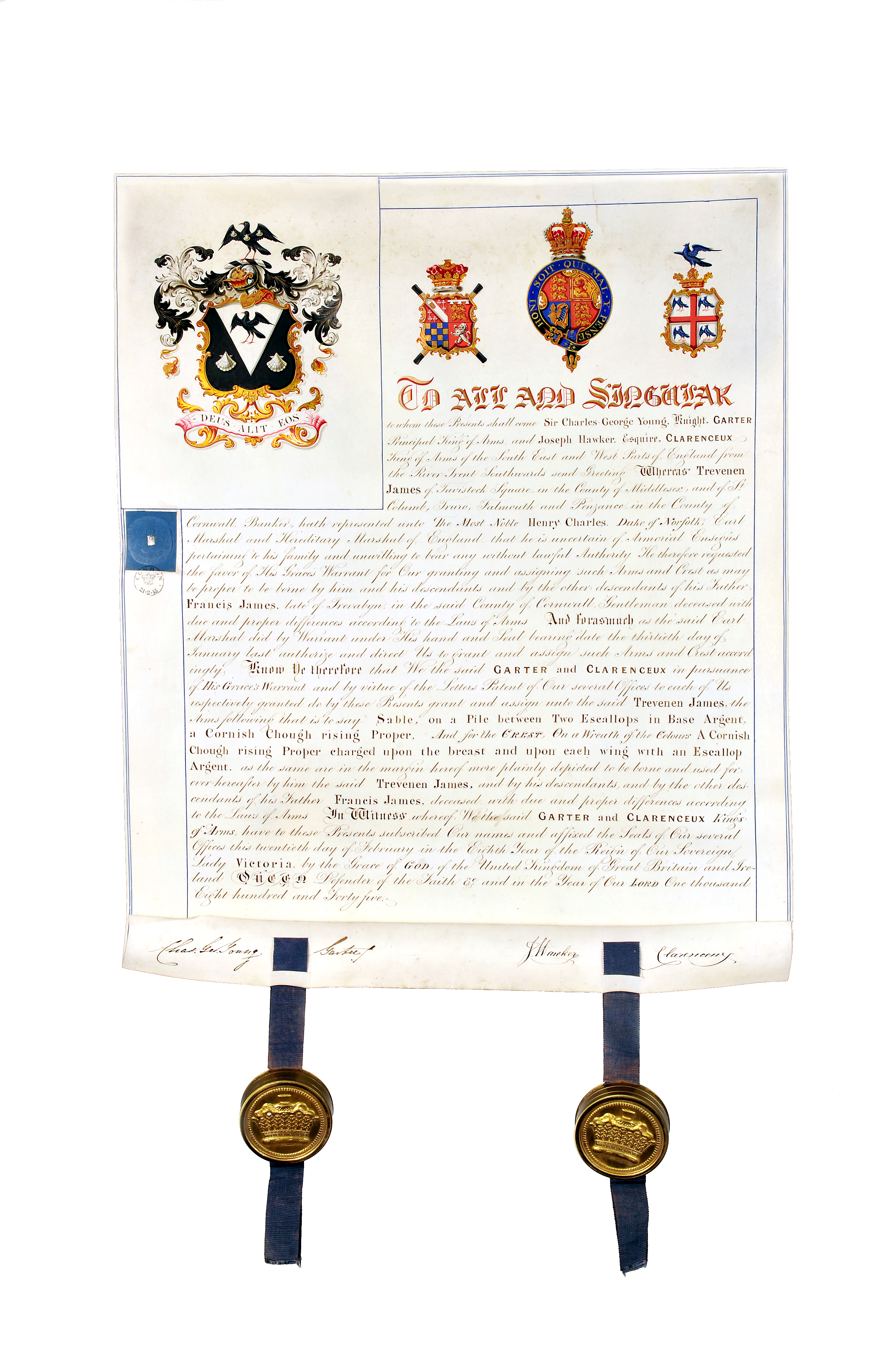 TO ALL AND SINGULAR to whom these Presents shall come, Sir Charles George Young, Knight, GARTER Principal King of Arms and Joseph HAWKER, Esquire, CLARENCEUX King of Arms of the South East and West Parts of England from the River Trent Southwards send Greeting. Whereas Trevenen James of Tavistock Square in the County of Middlesex, and of St. Columb, Truro, Falmouth and Penzance in the County of Cornwall, Banker, hath represented unto The Most Noble Henry Charles, Duke of Norfolk, Earl Marshal and Hereditary Marshal of England that he is uncertain of Armorial Ensigns pertaining to his family, and unwilling to bear any without lawful Authority. He therefore requested the favor of his Grace's Warrant for Our granting such Arms and Crest as may be proper to be borne by him and his descendants and by the other descendants of his Father Francis James, late of Trevabyn in the said County of Cornwall, Gentleman, deceased, with due and proper differences according to the Laws of Arms. And forasmuch as the said Earl Marshall did by Warrant under His hand and Seal bearing date the thirtieth day of January last authorize and direct us to grant and assign such Arms and Crest accordingly Know Ye therefore that We the said GARTER and CLARENCEUX in pursuance of His Grace's Warrant and by virtue of the Letters Patent of our several Offices to each of Us respectively granted do by these Presents grant and assign unto the said Trevenen James the Arms following, that is to say Sable, on a Pile between two Escallops in Base Argent, a Cornish Chough rising Proper. And for the Crest, On a Wreath of the Colours, a Cornish Chough rising Proper charged upon the breast and upon each wing with an Escallop Argent, as the same are in the margin hereof more plainly depicted to be borne and used for ever hereafter by him the said Trevenen James, and by his descendants and by the other descendants of his Father, Francis James, deceased with due and proper differences according to the Laws of Arms. In Witness whereof We the said GARTER and CLARENCEUX Kings of Arms have to these Presents subscribed Our names and affixed the seals of our several Offices this twentieth day of February in the Eighth Year of the Reign of Our Sovereign Lady Victoria by the Grace of God of the United Kingdom of Great Britain and Ireland, Queen, Defender of the Faith &c, and in the Year of Our LORD One Thousand Eight hundred and Forty five.
